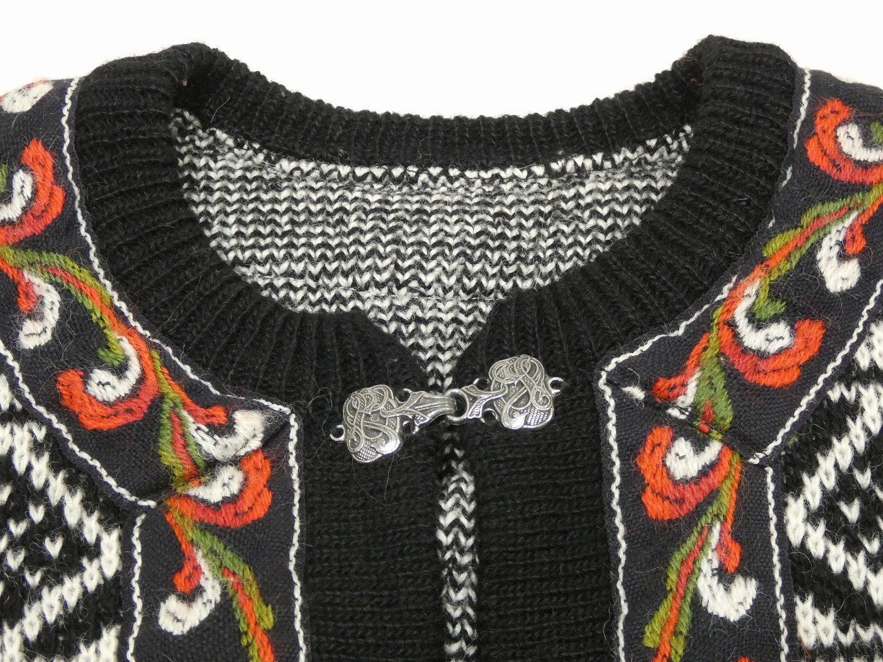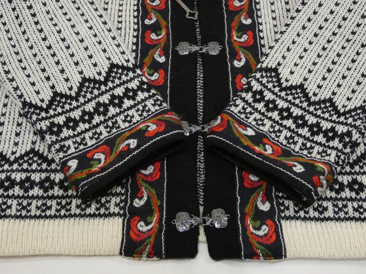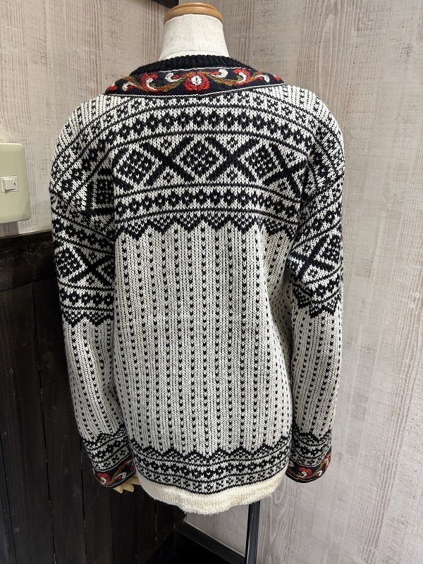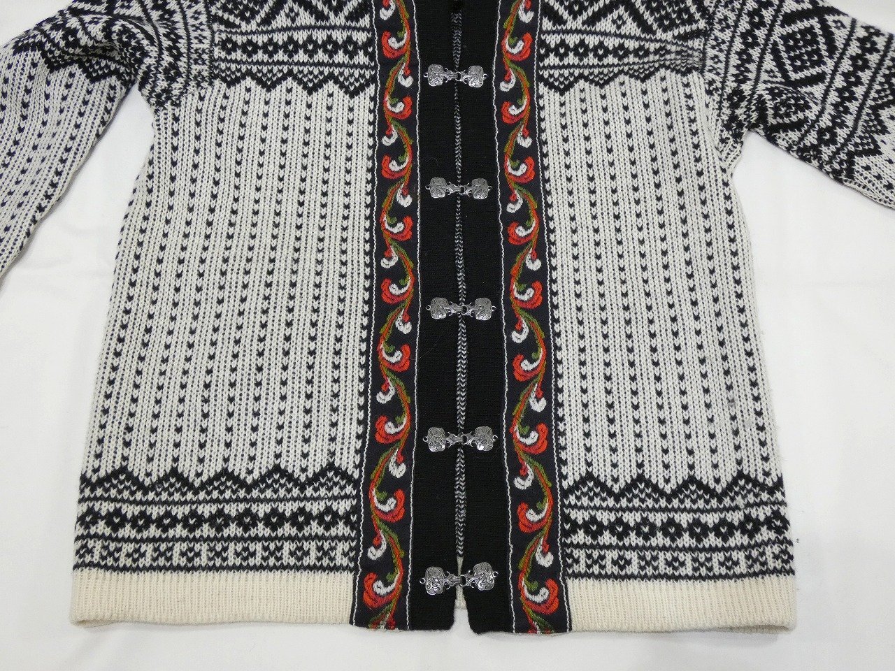 ブラック×ホワイトのカラーリングに、赤系のチロリアン刺繍が良いアクセントになりレトロ可愛い雰囲気です。また、ノルディックセーターらしいメタルホックボタンも凝ったデザインでとてもお洒落です。ユニセックスな着心地とシルエットでサイズ合えば男女共にお勧めです。トップスとしてはもちろん、しっかりした暖かみのある素材ですので、アウターとしても着て頂けます。状態のよいノルディックカーディガンも年々少なくなっていますので是非。