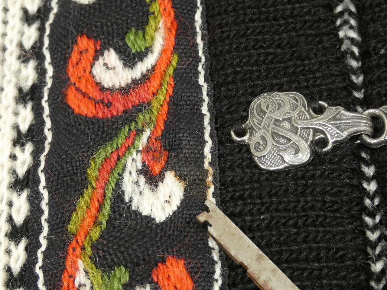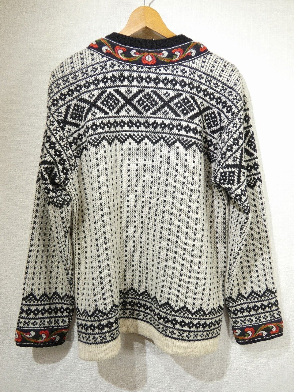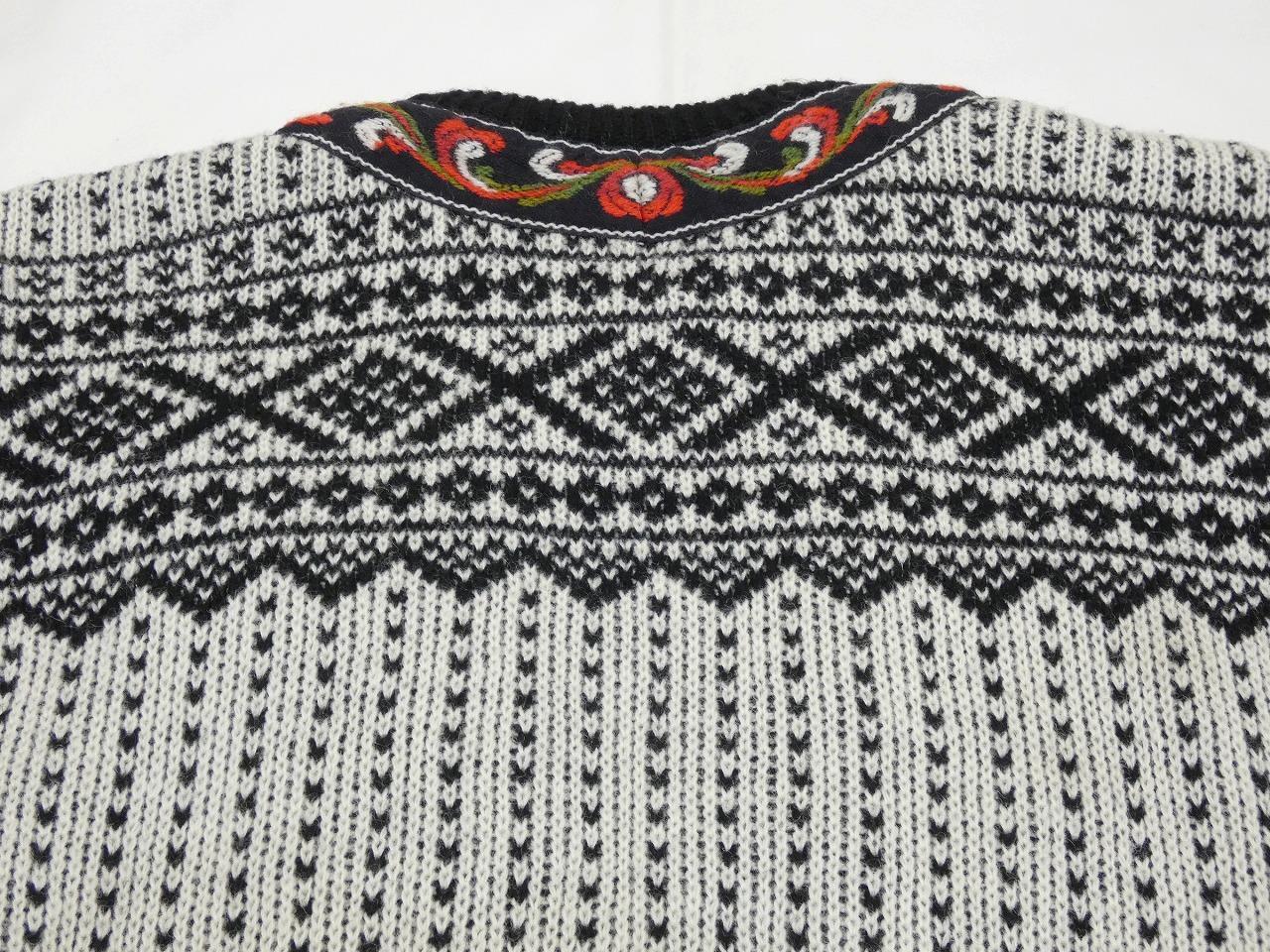 ブラック×ホワイトのカラーリングに、赤系のチロリアン刺繍が良いアクセントになりレトロ可愛い雰囲気です。また、ノルディックセーターらしいメタルホックボタンも凝ったデザインでとてもお洒落です。ユニセックスな着心地とシルエットでサイズ合えば男女共にお勧めです。トップスとしてはもちろん、しっかりした暖かみのある素材ですので、アウターとしても着て頂けます。状態のよいノルディックカーディガンも年々少なくなっていますので是非。