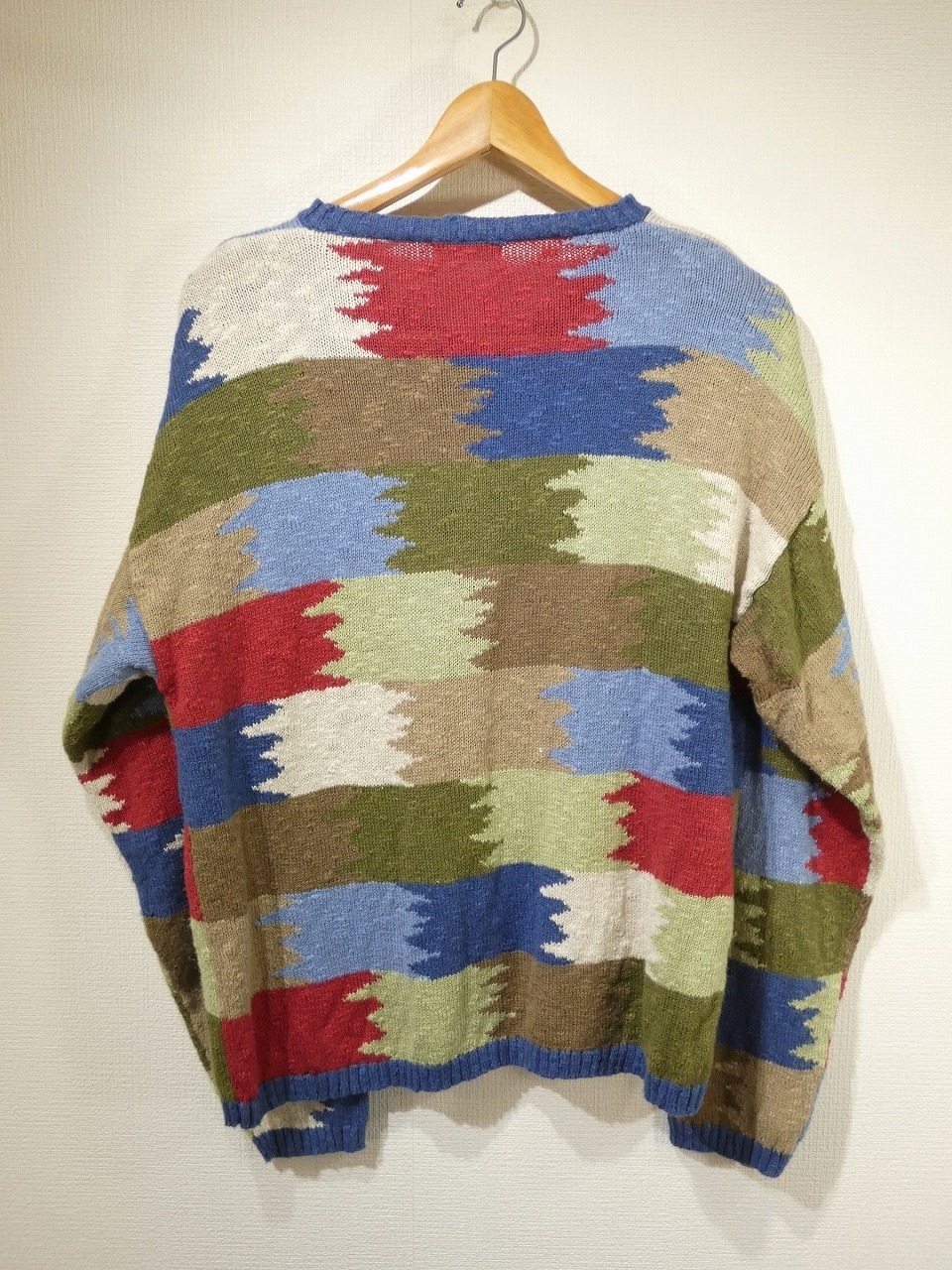 パッチワークの様なクレージーパターンで、少しネイティブ系模様にも感じられ個性的です。メタルボタンも良いポイントです。また、ゆったりとしたシルエットは着心地も抜群で、恐らくコットン混の素材は取扱いも比較的楽ちんです。存在感のあるニットですので、デニムやシンプルなボトムに合わせてみてはいかがでしょうか。古めのニットは他の方と被らないデザインばかりですので、コレクションするのも楽しそうです。
