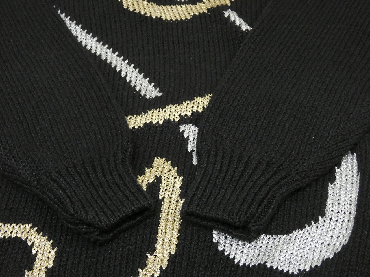 ブラックベースにゴールドとシルバーのラメ糸の模様編みが映えておしゃれです。また、コットン混で扱いも楽で当時のタグが付いた未使用なのも嬉しいポイントです。個性的な部分とシンプルな雰囲気がバランスのよいニットです。サイズ合えば男女共にお勧めです。